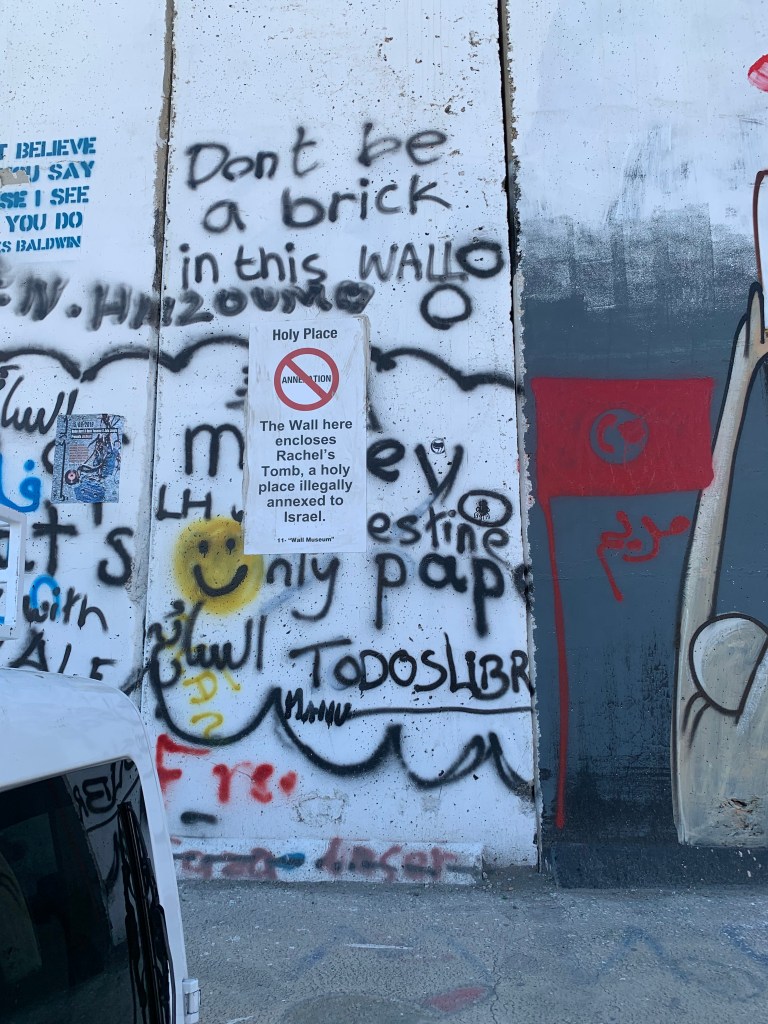 I think I was struck by two things at the checkpoint. The first is the difficulty in navigating it for Palestinians and how it would be awful to have to do this every day to go to work. The second was looking at the families and the children in lines. The children were smiling and happy. They again reminded me of the children in our JCC school. They waved and engaged. The universal beauty of children was clear and gave me hope that perhaps we can find common ground, perhaps we can find a solution to the conflict and perhaps these children can live a different life.