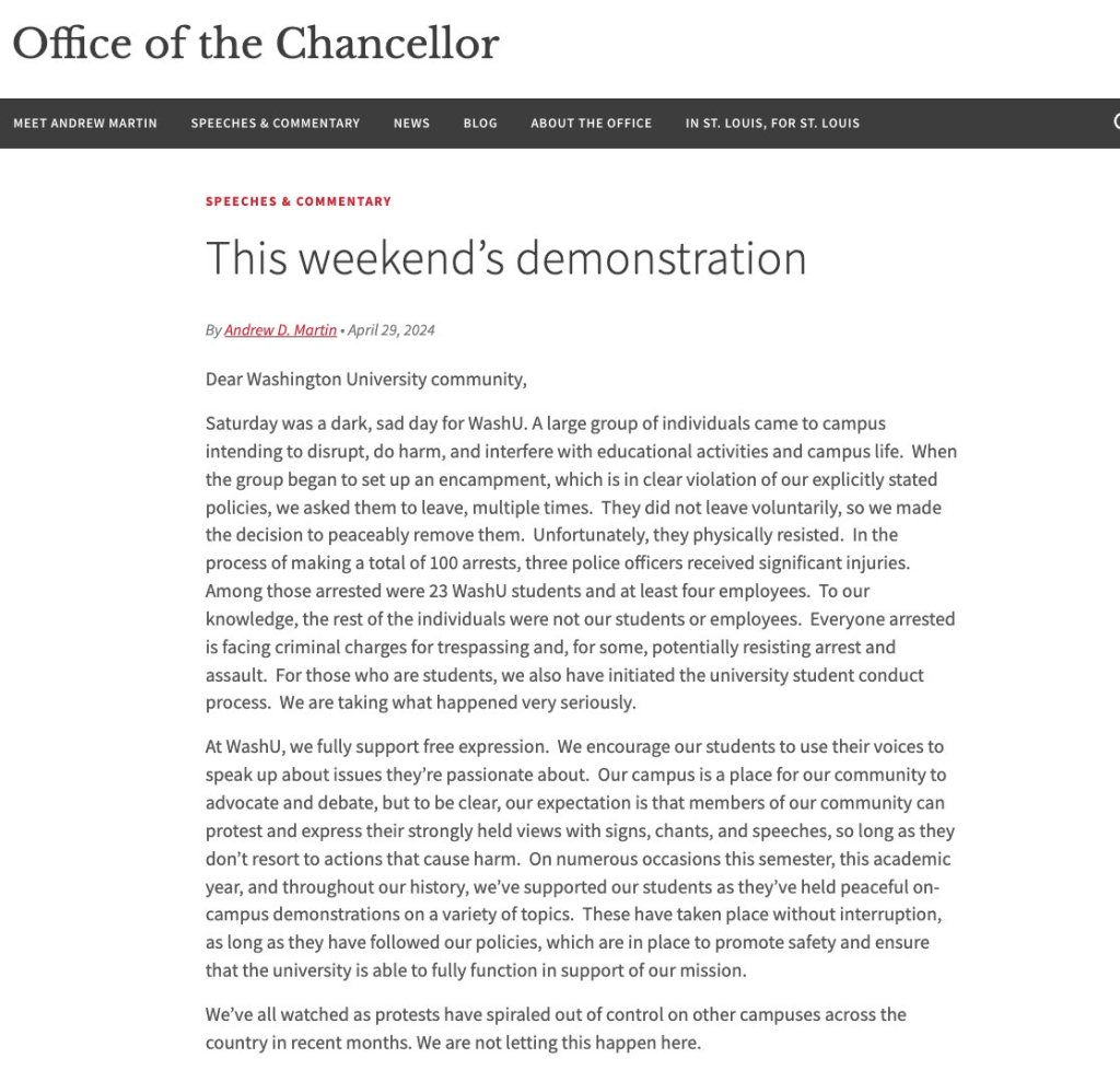 The leadership of Washington University in St. Louis put out a powerful statement about hateful protest on their campus and the arrests made because of the violation of their policies.