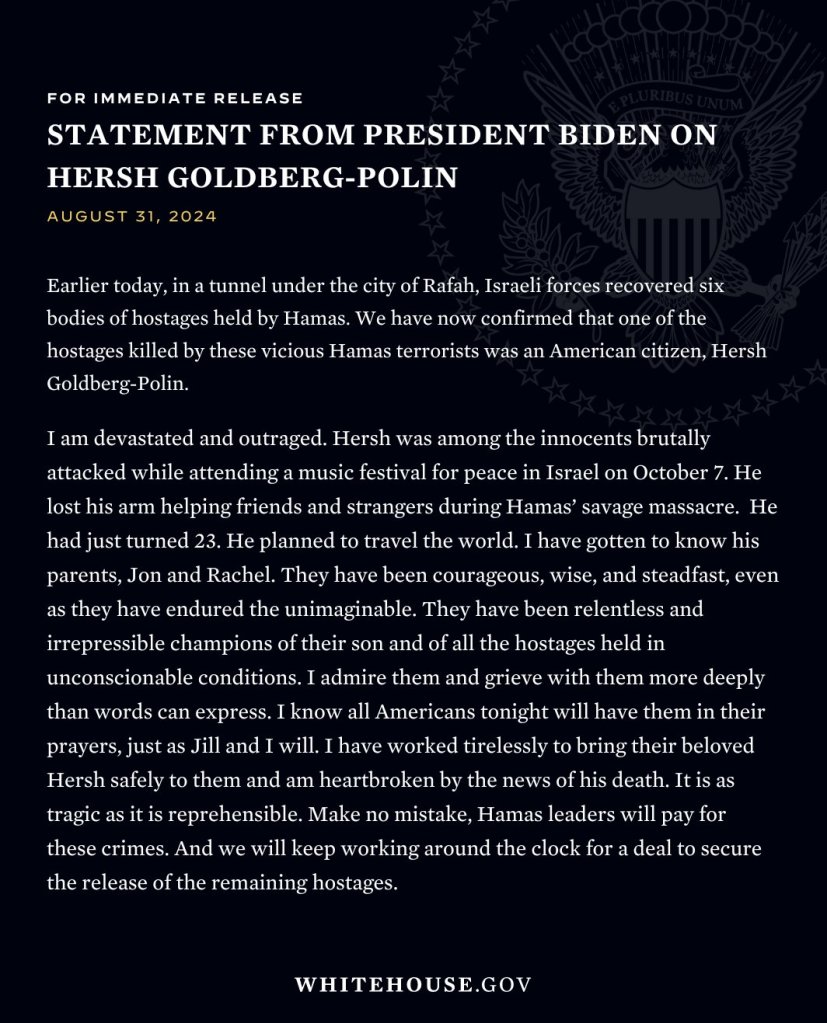 Now that we know that Hamas murdered Hersh and 5 other hostages just before they were going to be rescued, what will the response of Congress and the Biden administration be? We have seen the statements from both President Biden and Vice President Harris.