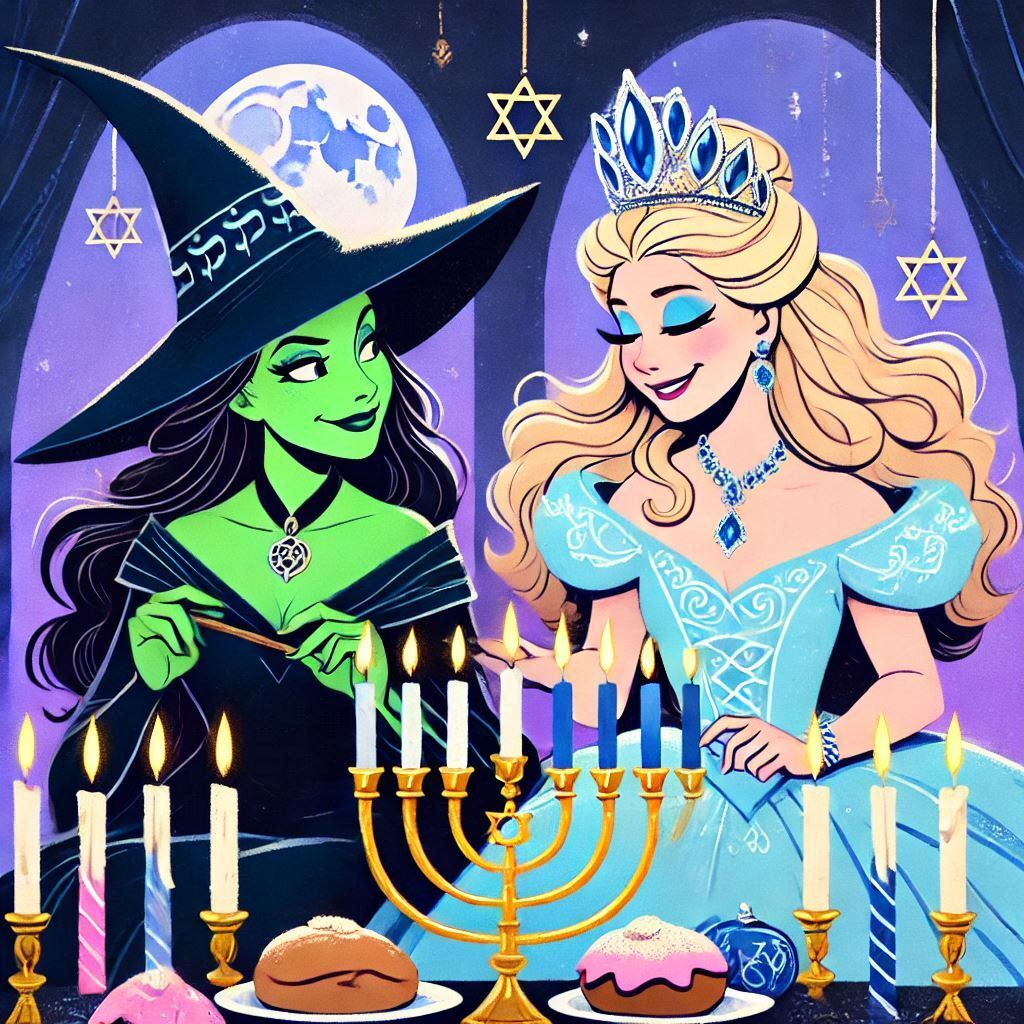 I asked a different AI art program to create an image of Elphaba and Glinda/Galinda celebrating Hanukkah. It came out like Disney Princesses. How many little girls would fall in love with being jewish because they had Jewish Princesses celebrating Hanukkah? Lighting the menorah together? Sufganyot in front of them.