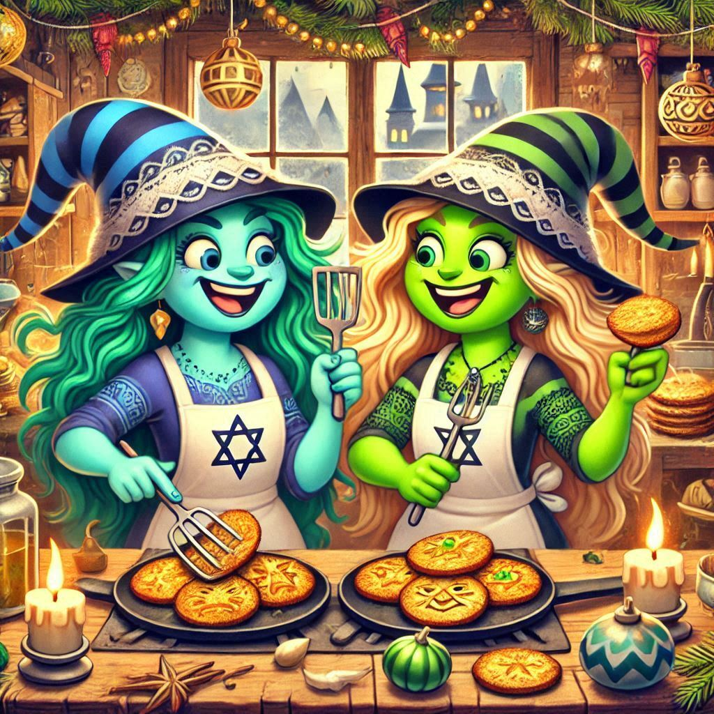 Here is Elphaba and Glinda/Galinda if they were Jewish and celebrating Hanukkah. Imagine them at your Hanukkah party. Imagine them lighting the menorah with you. How much fun would that be? Imagine a Hillel or Chabad Hanukkah with the Wicked theme. Making Judaism fun and cool isn’t that difficult as we saw with Adam Sandler and we see with Six13 and a little bit of AI graphic work.
