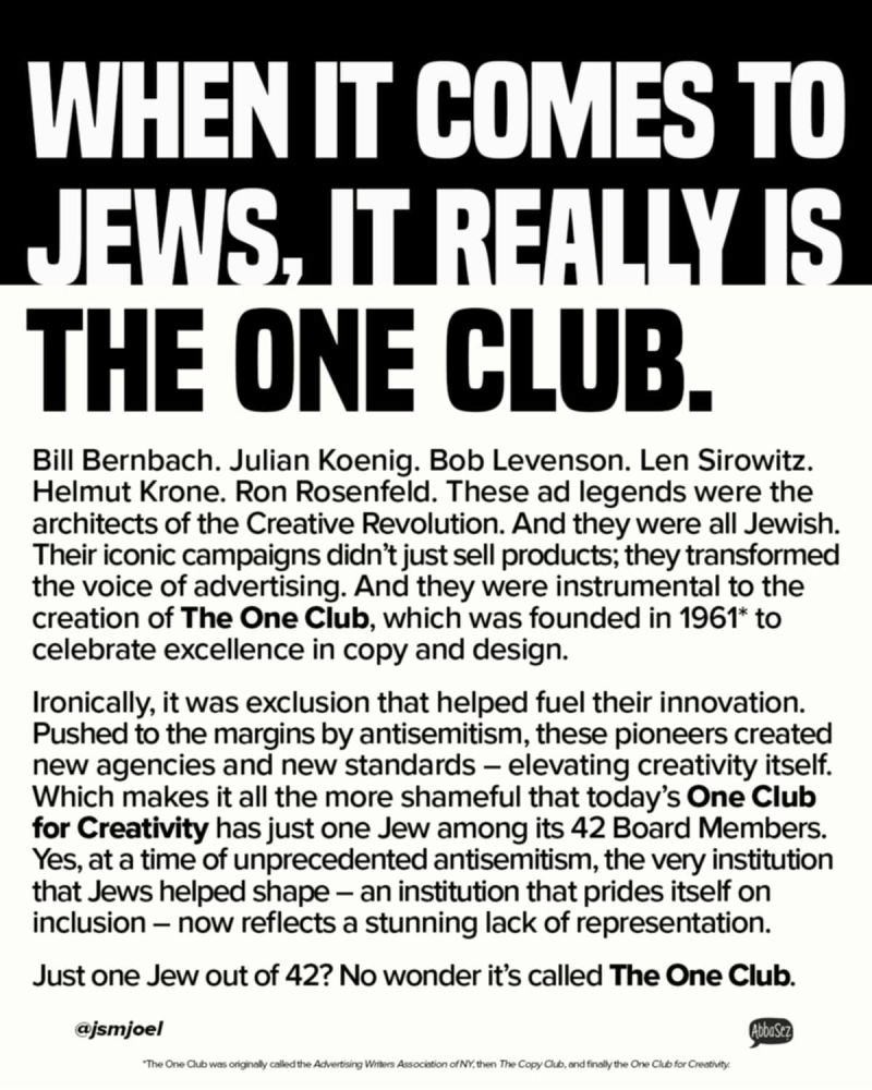 I also pointed out that only 1 of 42 board members is Jewish, despite generations of Jewish creatives who helped shape this industry. I can name at least 100 deserving Jewish creative leaders off the top of my head. That silence and lack of representation speaks volumes.
