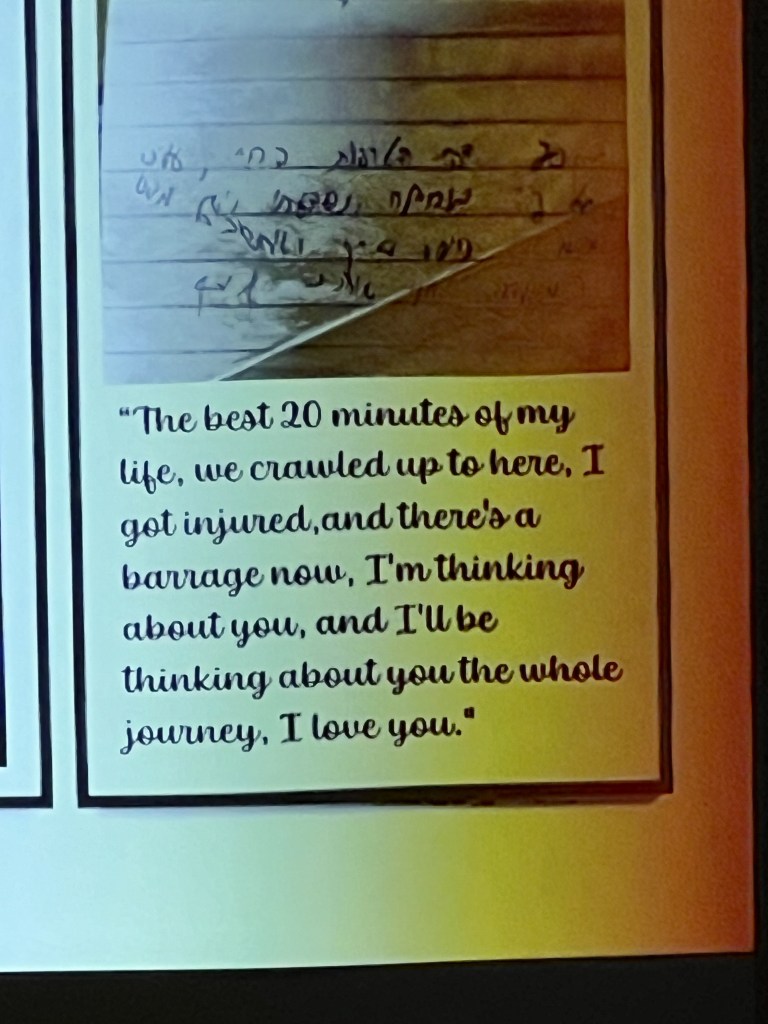 The second was about courage. Courage is not feeling fear or being afraid. Courage is feeling fear and being afraid and getting through it anyway. The 66 families that started Tel Aviv in 1908 felt plenty of fear, yet they would not let that fear stop them from following through and building the city of Tel Aviv. We heard from and met people from Kibbutz Alumim today. The Kibbutz is 3 km from Gaza and was attacked on October 7. It is the only kibbutz that was attacked on October 7th, the terrorists got into the kibbutz, but did not get into the houses. Those on the kibbutz who hid in their safe rooms with their families and those who defended it were scared but they fought through the fear to survive. Courage looks different but always involves facing your fears and finding a way through them.