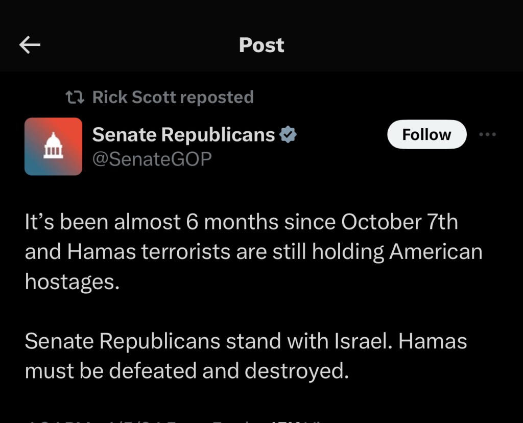 My own Senator, Rick Scott, has been vocal about his support for Israel. He tweets daily about the hostages, never letting them fall out of our thoughts.