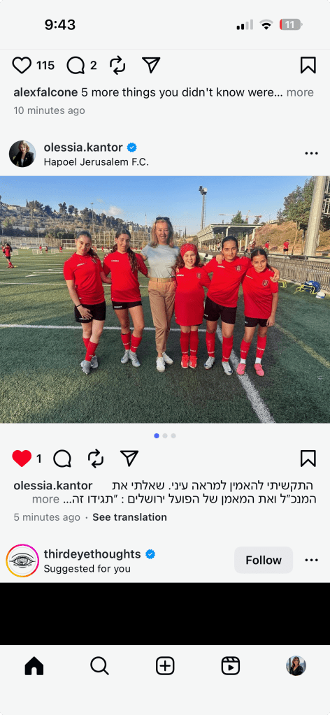 I went to visit Hapoel Jerusalem Football Club (HJFC), a team that is much more than a professional team in the Premier League for men and women’s soccer. Their social programs are changing the face of Jerusalem and the future of Israel. Hersh Goldberg-Polin (z’l) was one of the leaders of their fan club. I wear my Hapoel Jerusalem FC shirt with his face on it proudly. It speaks to people living by their values, choosing to make the world a better place which means they are happier in their daily lives. Read the post below which describes somebody’s experience with the girls program of HJFC. It’s extraordinary.
